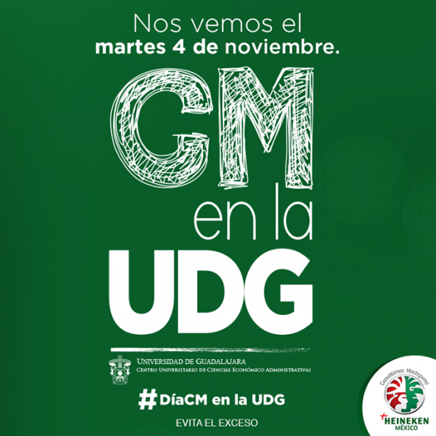 Cuauhtémoc Moctezuma y HEINEKEN México te invitan a pasar un #DíaCM en la UDG, para el que falta menos de una semana y en el que participarán con conferencias magistrales Marc Busain, CEO y presidente de Cuauhtémoc Moctezuma - HEINEKEN México; Leandro Berrone, VP de Brand Marketing de Cuauhtémoc Moctezuma; y Jaime Mayagoitia, Director de planeación y control estratégico.